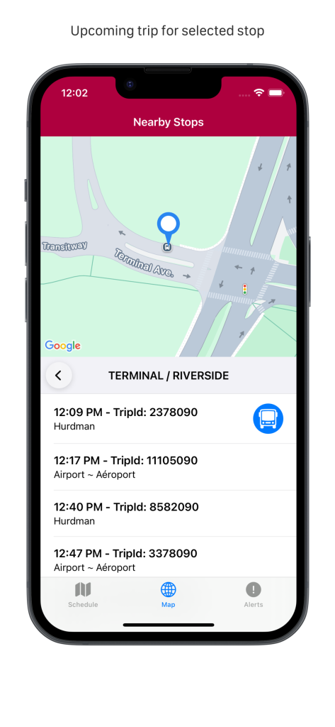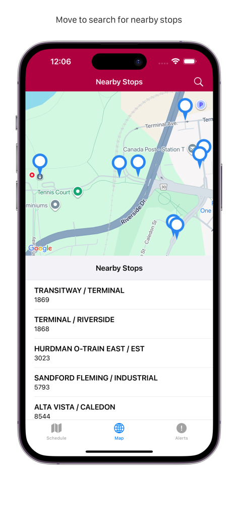When a stop is selected; map will zoom to the stop. On this screen, you can move back to the Nearby Stops screen by tapping the back button.