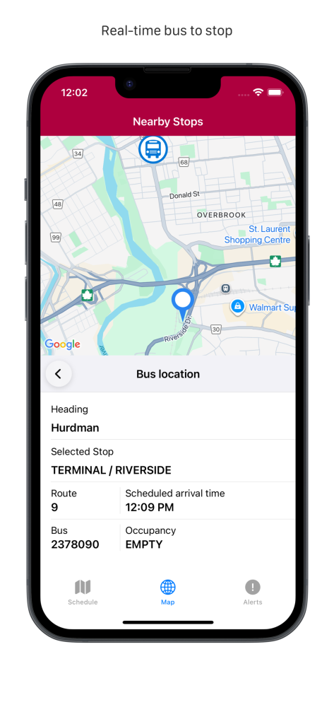 When a real-time vehicle position is selected. Map will zoom to include both bus and stop location. Additional information is displayed in the detail location.